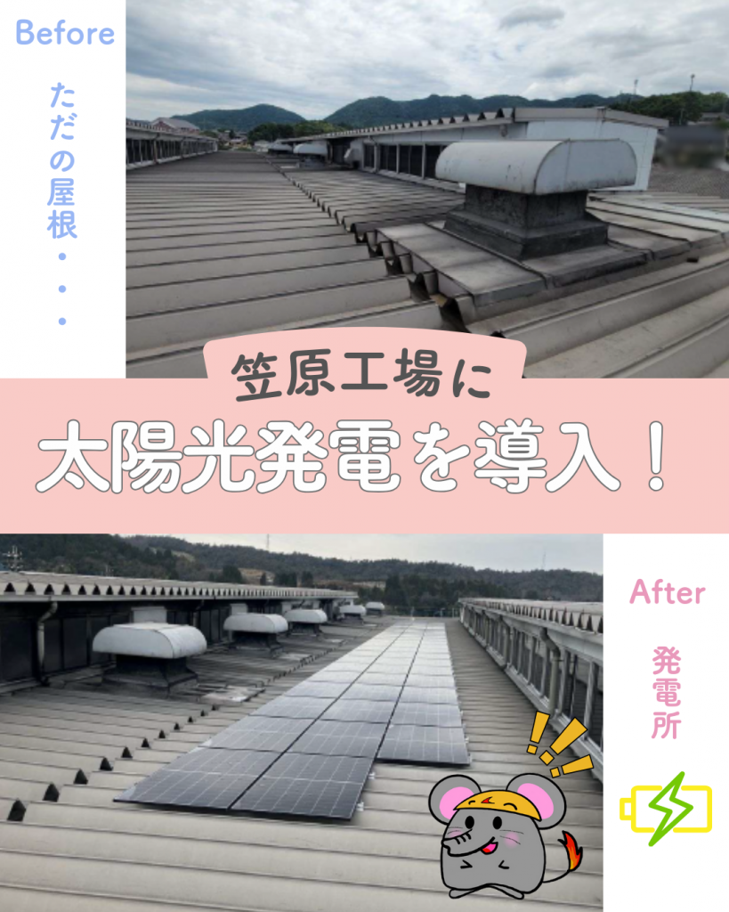 当社はこの度、カーボンニュートラルに向けた取り組みの一環として、笠原工場の屋根に太陽光発電設備を設置し、稼働を開始いたしました。